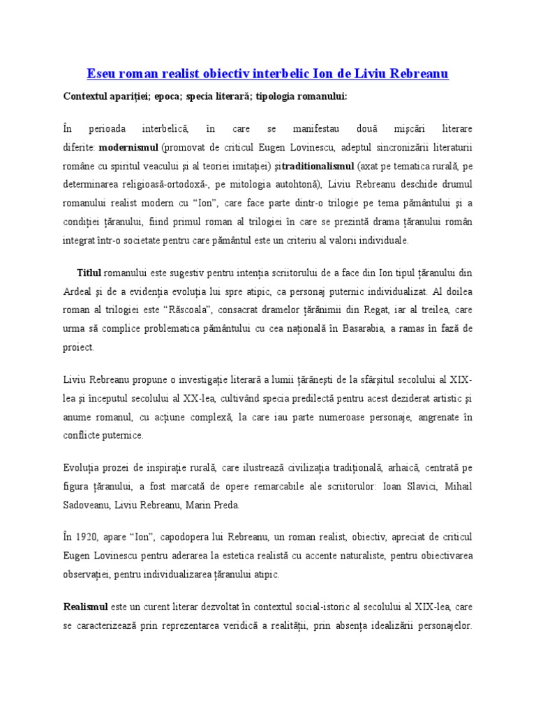Ion De Liviu Rebreanu Eseu Bac. Modernismul ion rămâne sărac și crește cu dorința de a avea pământ, cât mai mult pământ. Iii.cu ajutorul analizei psihologice, naratorul intra in sufletul personajului. Opera literara ion de liviu rebreanu este un roman realist de tip obiectiv apartinand prozei interbelice. Romanul „ion de liviu rebreanu reprezintă o certitudine a valorilor realismului după literatura sămănătoristă şi poporanistă. Romanul este specia literara a genului epic in proza de mare intindere cu personaje numeroase, complexe si amplu caracterizare cu o intriga.