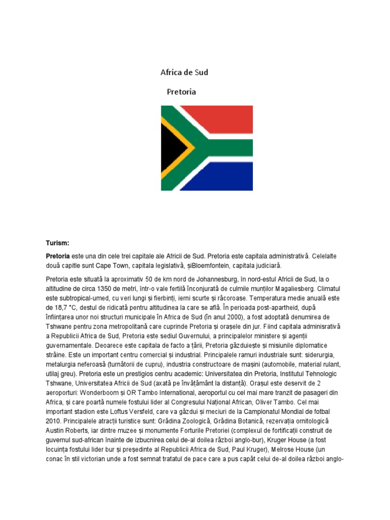 Pretoria se gaseste pe raul aapies, un afluent al fluviului limpopo, si a fost intemeiata in anul 1885 de catre martinus pretorius, iar in anul 1860 devine sediul parlamentului statului transvaal. Africa de sud este un stat multietnic asezat la extremitatea sudica a continentului africa. Descrisă ca fiind ţara miracolelor, africa de sud este statul cel mai dezvoltat din punct de vedere economic de pe întreg continentul african, cu o putere de cumpărare pe cap de locuitor de 10.000 de dolari pe an.